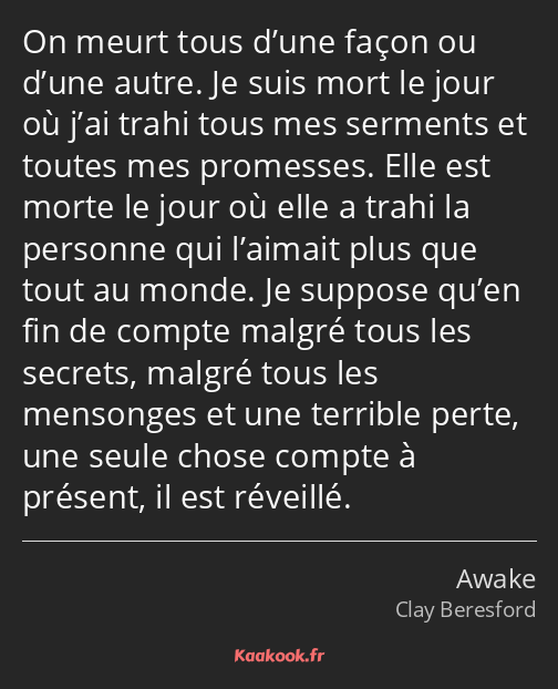 On meurt tous d’une façon ou d’une autre. Je suis mort le jour où j’ai trahi tous mes serments et toutes mes promesses. Elle est morte le jour où elle a trahi la personne qui l’aimait plus que tout au monde. Je suppose qu’en fin de compte malgré tous les secrets, malgré tous les mensonges et une terrible perte, une seule chose compte à présent, il est réveillé.