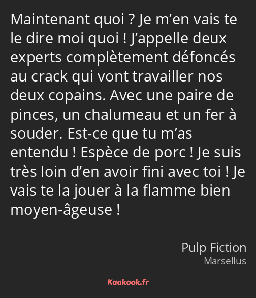 Maintenant quoi ? Je m’en vais te le dire moi quoi ! J’appelle deux experts complètement défoncés au crack qui vont travailler nos deux copains. Avec une paire de pinces, un chalumeau et un fer à souder. Est-ce que tu m’as entendu ! Espèce de porc ! Je suis très loin d’en avoir fini avec toi ! Je vais te la jouer à la flamme bien moyen-âgeuse !