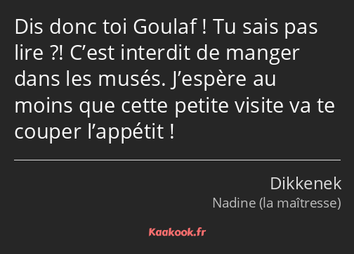 Dis donc toi Goulaf ! Tu sais pas lire ?! C’est interdit de manger dans les musés. J’espère au moins que cette petite visite va te couper l’appétit !