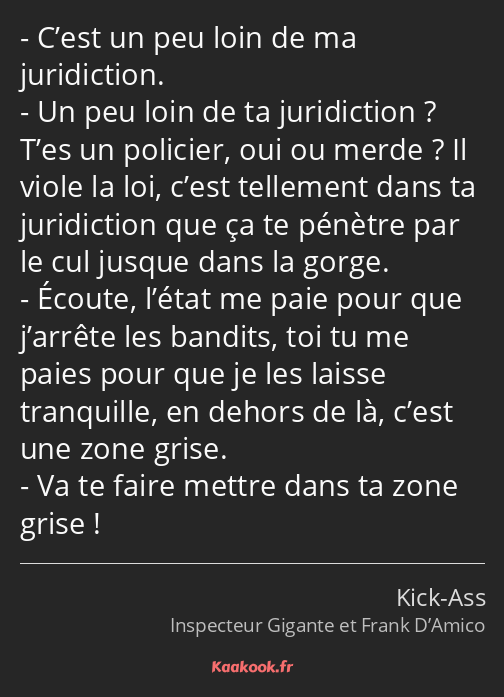- Un peu loin de ta juridiction ? T’es un policier, oui ou merde ? Il viole la loi, c’est tellement dans ta juridiction que ça te pénètre par le cul jusque dans la gorge.