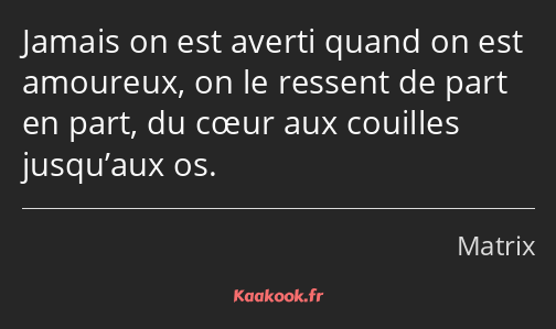 Jamais on est averti quand on est amoureux, on le ressent de part en part, du cœur aux couilles jusqu’aux os.