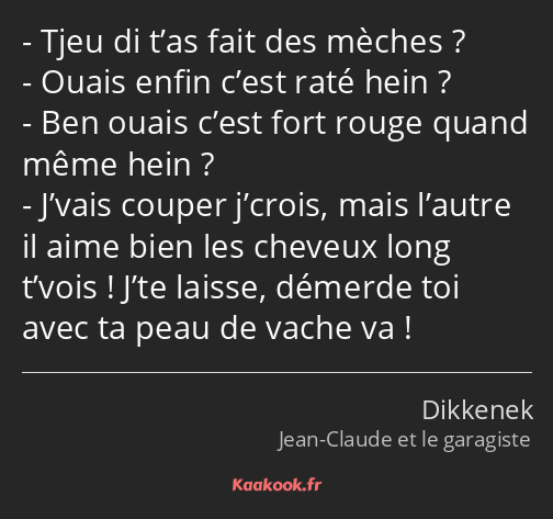 - J’vais couper j’crois, mais l’autre il aime bien les cheveux long t’vois ! J’te laisse, démerde toi avec ta peau de vache va !