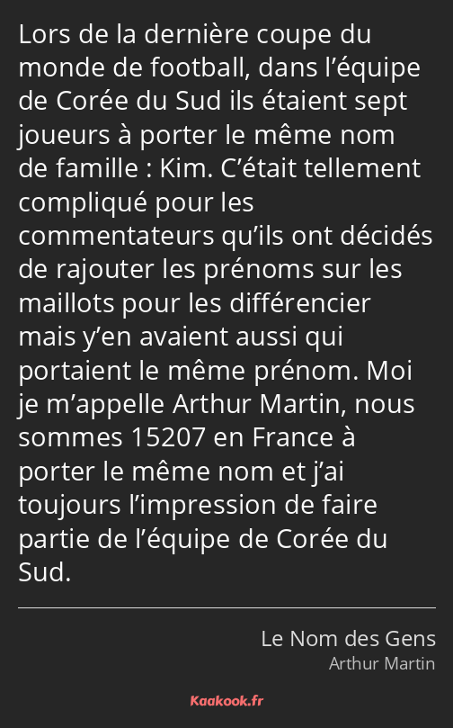 Lors de la dernière coupe du monde de football, dans l’équipe de Corée du Sud ils étaient sept joueurs à porter le même nom de famille : Kim. C’était tellement compliqué pour les commentateurs qu’ils ont décidés de rajouter les prénoms sur les maillots pour les différencier mais y’en avaient aussi qui portaient le même prénom. Moi je m’appelle Arthur Martin, nous sommes 15207 en France à porter le même nom et j’ai toujours l’impression de faire partie de l’équipe de Corée du Sud.