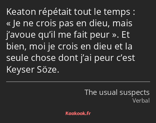 Keaton répétait tout le temps : « Je ne crois pas en dieu, mais j’avoue qu’il me fait peur ». Et bien, moi je crois en dieu et la seule chose dont j’ai peur c’est Keyser Söze.
