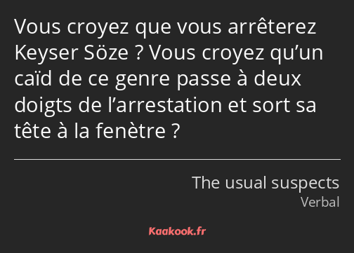 Vous croyez que vous arrêterez Keyser Söze ? Vous croyez qu’un caïd de ce genre passe à deux doigts de l’arrestation et sort sa tête à la fenètre ?