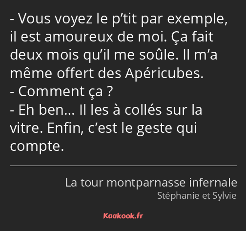 - Vous voyez le p’tit par exemple, il est amoureux de moi. Ça fait deux mois qu’il me soûle. Il m’a même offert des Apéricubes.