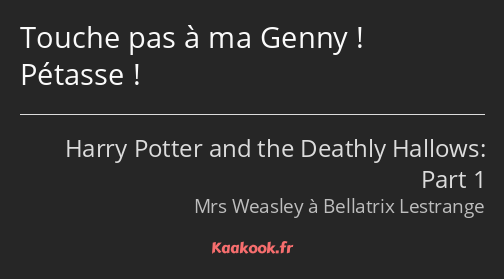 - Ce moment dans le film c’est quand il y a la guerre dans la salle principale entre les mange-morts et les élèves de poudlard et un moment Genny Weasley essaye de tuer Bellatrix (une mange-mort) et Molly Weasley arrive d’un coup, dit cette phrase et tue bellatrix 5 secondes après.
