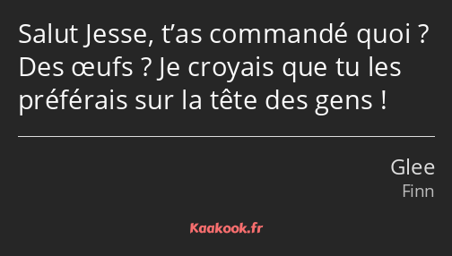 Salut Jesse, t’as commandé quoi ? Des œufs ? Je croyais que tu les préférais sur la tête des gens !