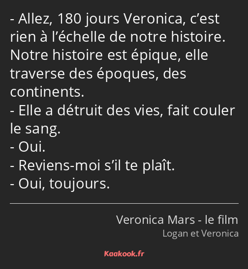 - Allez, 180 jours Veronica, c’est rien à l’échelle de notre histoire. Notre histoire est épique, elle traverse des époques, des continents.