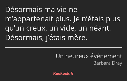 Désormais ma vie ne m’appartenait plus. Je n’étais plus qu’un creux, un vide, un néant. Désormais, j’étais mère.