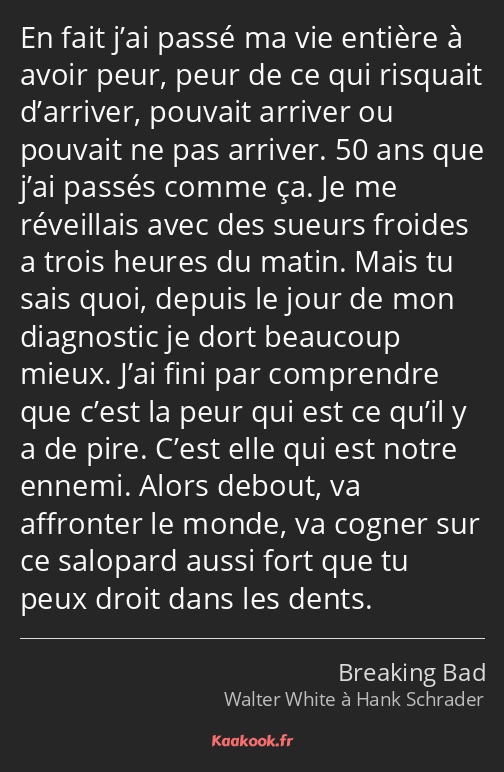 En fait j’ai passé ma vie entière à avoir peur, peur de ce qui risquait d’arriver, pouvait arriver ou pouvait ne pas arriver. 50 ans que j’ai passés comme ça. Je me réveillais avec des sueurs froides a trois heures du matin. Mais tu sais quoi, depuis le jour de mon diagnostic je dort beaucoup mieux. J’ai fini par comprendre que c’est la peur qui est ce qu’il y a de pire. C’est elle qui est notre ennemi. Alors debout, va affronter le monde, va cogner sur ce salopard aussi fort que tu peux droit dans les dents.