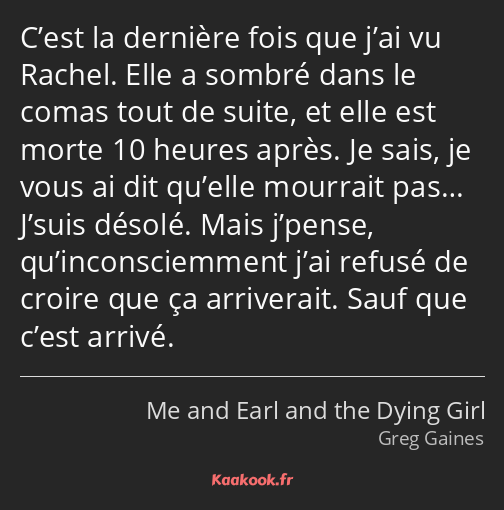 C’est la dernière fois que j’ai vu Rachel. Elle a sombré dans le comas tout de suite, et elle est morte 10 heures après. Je sais, je vous ai dit qu’elle mourrait pas… J’suis désolé. Mais j’pense, qu’inconsciemment j’ai refusé de croire que ça arriverait. Sauf que c’est arrivé.