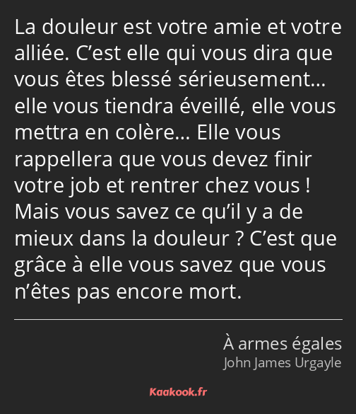 La douleur est votre amie et votre alliée. C’est elle qui vous dira que vous êtes blessé sérieusement… elle vous tiendra éveillé, elle vous mettra en colère… Elle vous rappellera que vous devez finir votre job et rentrer chez vous ! Mais vous savez ce qu’il y a de mieux dans la douleur ? C’est que grâce à elle vous savez que vous n’êtes pas encore mort.