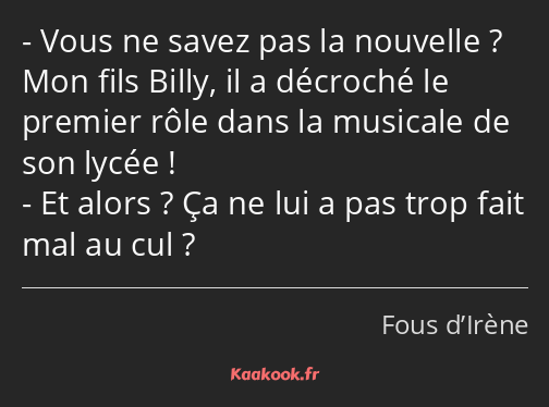 - Vous ne savez pas la nouvelle ? Mon fils Billy, il a décroché le premier rôle dans la musicale de son lycée !