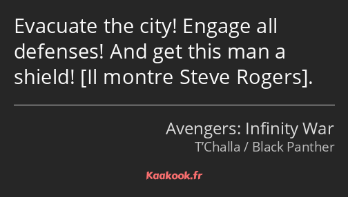 Evacuate the city! Engage all defenses! And get this man a shield! [Il montre Steve Rogers].