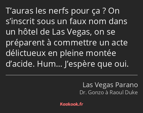 T’auras les nerfs pour ça ? On s’inscrit sous un faux nom dans un hôtel de Las Vegas, on se préparent à commettre un acte délictueux en pleine montée d’acide. Hum… J’espère que oui.