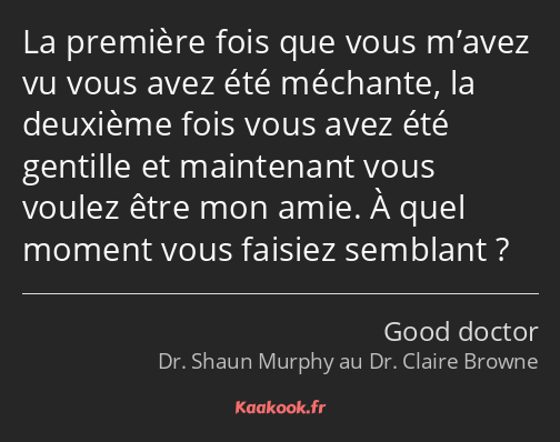 La première fois que vous m’avez vu vous avez été méchante, la deuxième fois vous avez été gentille et maintenant vous voulez être mon amie. À quel moment vous faisiez semblant ?