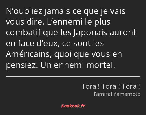 N’oubliez jamais ce que je vais vous dire. L’ennemi le plus combatif que les Japonais auront en face d’eux, ce sont les Américains, quoi que vous en pensiez. Un ennemi mortel.