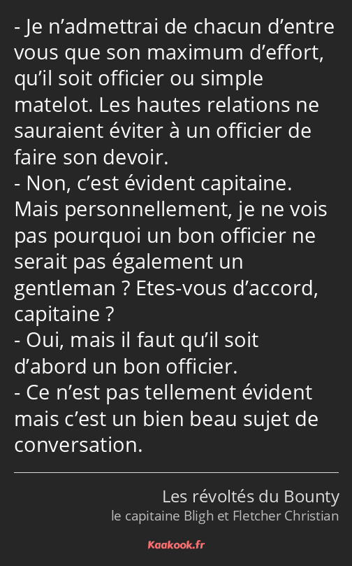 - Je n’admettrai de chacun d’entre vous que son maximum d’effort, qu’il soit officier ou simple matelot. Les hautes relations ne sauraient éviter à un officier de faire son devoir.