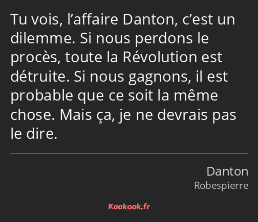 Tu vois, l’affaire Danton, c’est un dilemme. Si nous perdons le procès, toute la Révolution est détruite. Si nous gagnons, il est probable que ce soit la même chose. Mais ça, je ne devrais pas le dire.