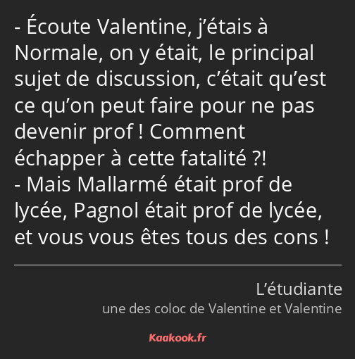 - Écoute Valentine, j’étais à Normale, on y était, le principal sujet de discussion, c’était qu’est ce qu’on peut faire pour ne pas devenir prof ! Comment échapper à cette fatalité ?!