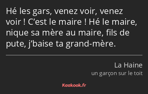 Hé les gars, venez voir, venez voir ! C’est le maire ! Hé le maire, nique sa mère au maire, fils de pute, j’baise ta grand-mère.