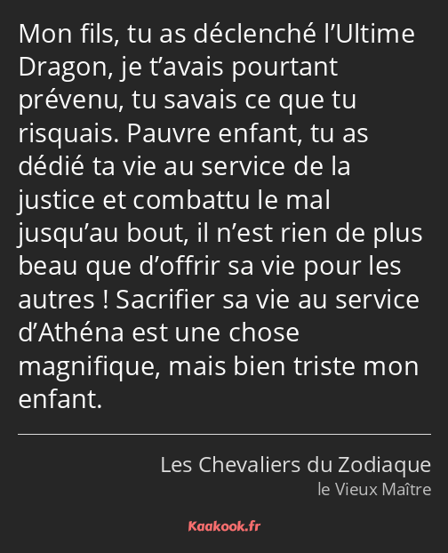 Mon fils, tu as déclenché l’Ultime Dragon, je t’avais pourtant prévenu, tu savais ce que tu risquais. Pauvre enfant, tu as dédié ta vie au service de la justice et combattu le mal jusqu’au bout, il n’est rien de plus beau que d’offrir sa vie pour les autres ! Sacrifier sa vie au service d’Athéna est une chose magnifique, mais bien triste mon enfant.