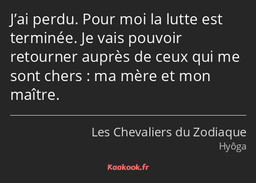 J’ai perdu. Pour moi la lutte est terminée. Je vais pouvoir retourner auprès de ceux qui me sont chers : ma mère et mon maître.