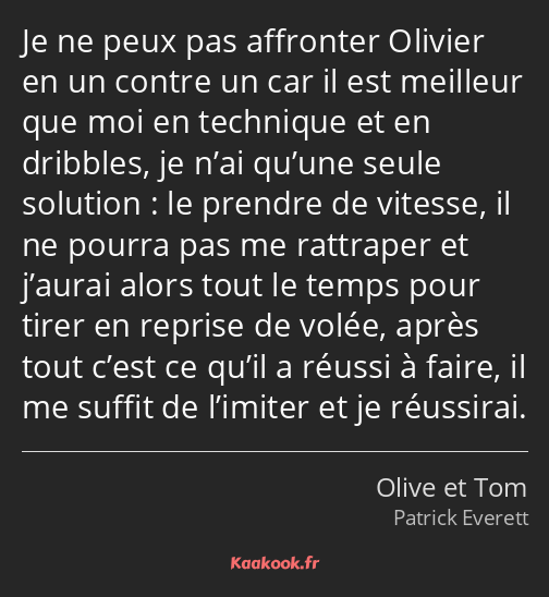 Je ne peux pas affronter Olivier en un contre un car il est meilleur que moi en technique et en dribbles, je n’ai qu’une seule solution : le prendre de vitesse, il ne pourra pas me rattraper et j’aurai alors tout le temps pour tirer en reprise de volée, après tout c’est ce qu’il a réussi à faire, il me suffit de l’imiter et je réussirai.