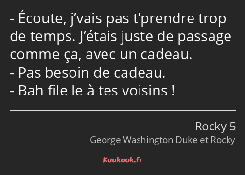 - Écoute, j’vais pas t’prendre trop de temps. J’étais juste de passage comme ça, avec un cadeau.