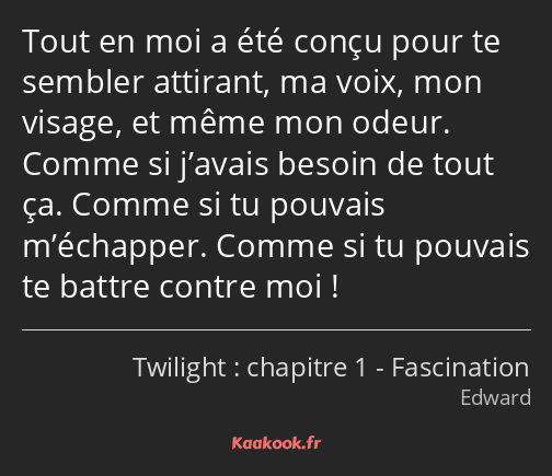 Tout en moi a été conçu pour te sembler attirant, ma voix, mon visage, et même mon odeur. Comme si j’avais besoin de tout ça. Comme si tu pouvais m’échapper. Comme si tu pouvais te battre contre moi !