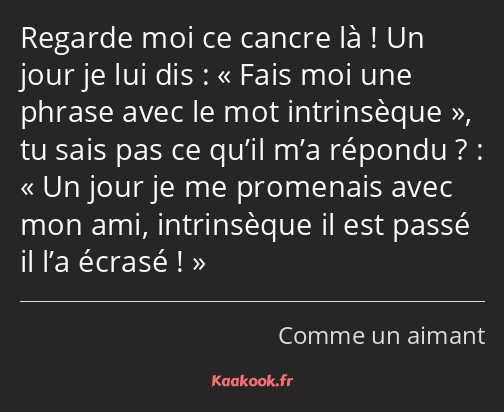 Regarde moi ce cancre là ! Un jour je lui dis : « Fais moi une phrase avec le mot intrinsèque », tu sais pas ce qu’il m’a répondu ? : « Un jour je me promenais avec mon ami, intrinsèque il est passé il l’a écrasé ! »