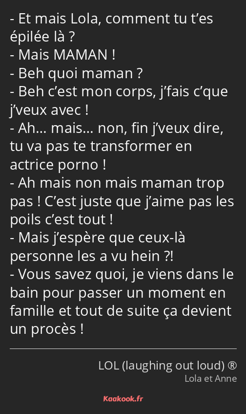 - Ah mais non mais maman trop pas ! C’est juste que j’aime pas les poils c’est tout !