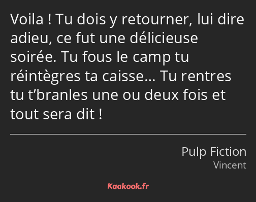 Voila ! Tu dois y retourner, lui dire adieu, ce fut une délicieuse soirée. Tu fous le camp tu réintègres ta caisse… Tu rentres tu t’branles une ou deux fois et tout sera dit !