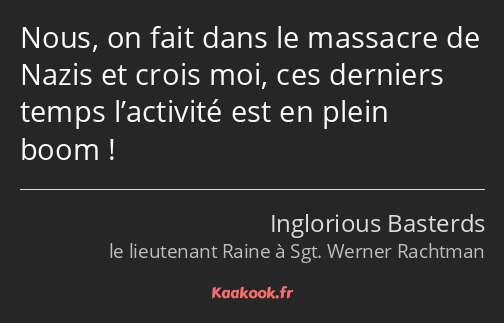 Nous, on fait dans le massacre de Nazis et crois moi, ces derniers temps l’activité est en plein boom !