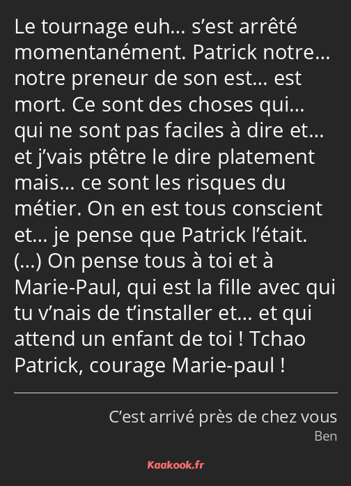 Le tournage euh… s’est arrêté momentanément. Patrick notre… notre preneur de son est… est mort. Ce sont des choses qui… qui ne sont pas faciles à dire et… et j’vais ptêtre le dire platement mais… ce sont les risques du métier. On en est tous conscient et… je pense que Patrick l’était. (…) On pense tous à toi et à Marie-Paul, qui est la fille avec qui tu v’nais de t’installer et… et qui attend un enfant de toi ! Tchao Patrick, courage Marie-paul !