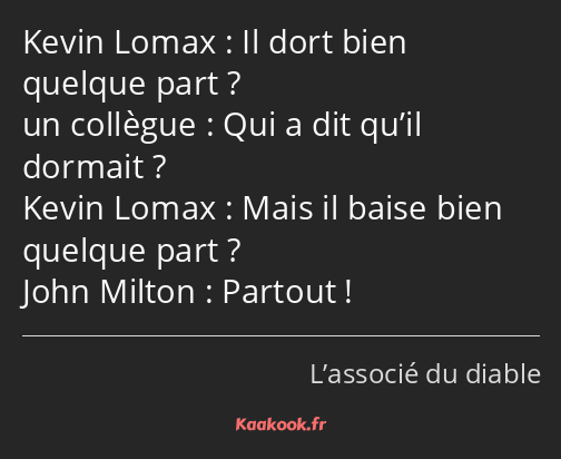 - Kevin, jeune avocat brillant, est convoqué dans l’appartement de son énigmatique employeur. L’appartement en question n’est constitué que d’une seule pièce dans laquelle il n’y a pas de lit. Kevin s’en étonne auprès de son collègue.