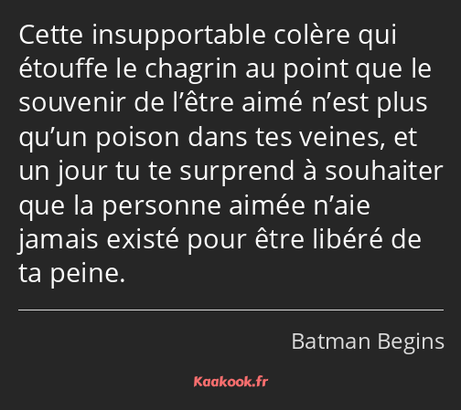 Cette insupportable colère qui étouffe le chagrin au point que le souvenir de l’être aimé n’est plus qu’un poison dans tes veines, et un jour tu te surprend à souhaiter que la personne aimée n’aie jamais existé pour être libéré de ta peine.